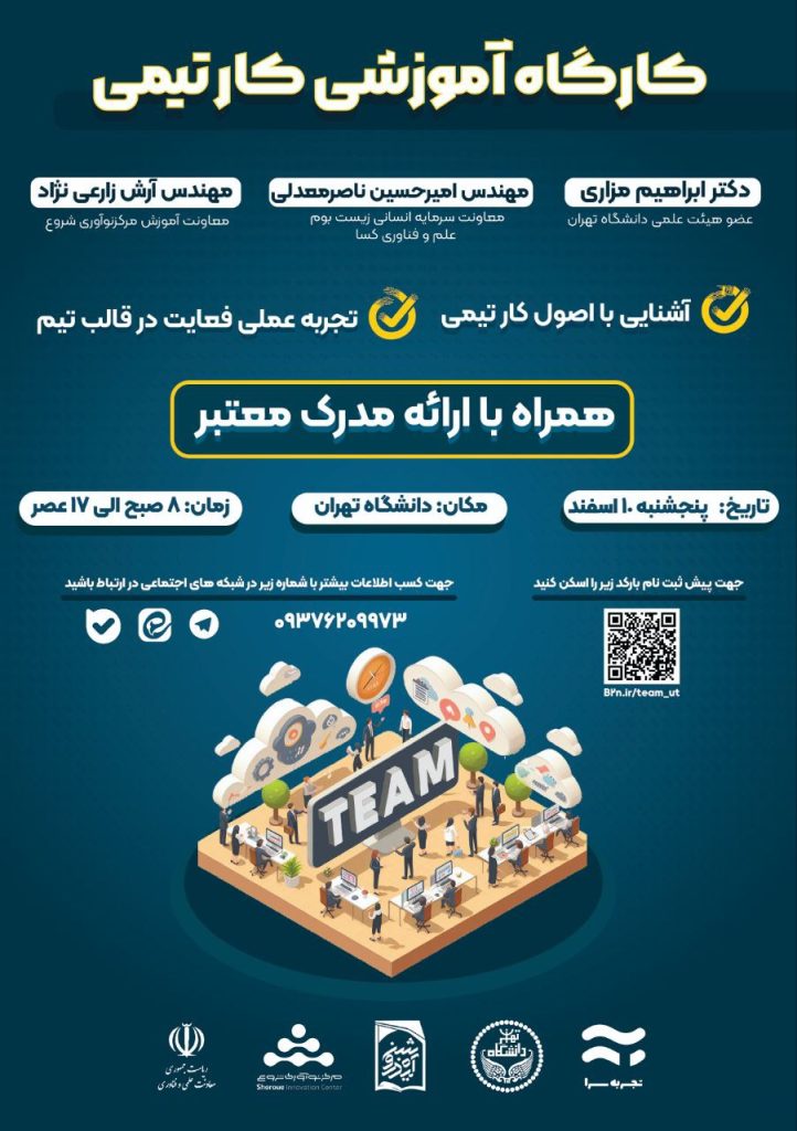 کارگاه کار تیمی یک برنامه آموزشی است که به منظور تقویت مهارتهای همکاری و ارتباطات مؤثر در بین اعضای تیمها طراحی شده است. در این کارگاه، شرکتکنندگان با تکنیکها و ابزارهای مختلفی آشنا میشوند که به بهبود تعاملات گروهی، حل تعارضات و افزایش بهرهوری کمک میکند.