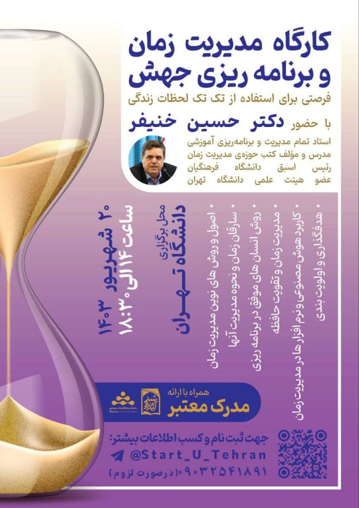 کارگاه مدیریت زمان جهش به منظور کمک به دانشجویان در برنامهریزی و مدیریت صحیح زمان برگزار میشود. با نزدیک شدن به فصل کلاسها، اهمیت این مهارتها برای دانشجویان بیشتر از همیشه احساس میشود. در این کارگاه، شرکتکنندگان با اصول برنامهریزی و تکنیکهای مدیریت زمان آشنا میشوند تا بتوانند به تمامی وظایف خود از جمله درسها، پروژهها و فعالیتهای اجتماعی بپردازند و در عین حال زمان مناسبی برای تفریح نیز داشته باشند. این کارگاه با حضور دکتر حسین خنیفر، عضو هیئت علمی دانشگاه تهران و استاد تمام مدیریت و برنامهریزی آموزشی، در تاریخ ۲۰ شهریور ماه از ساعت ۱۴ الی ۱۸:۳۰ به صورت حضوری در دانشگاه تهران برگزار میشود. شرکتکنندگان با دریافت مدرک معتبر و بهرهمندی از تخفیفهای ویژه، فرصتی عالی برای یادگیری و بهبود مهارتهای خود خواهند داشت. ظرفیت این کارگاه محدود است، بنابراین توصیه میشود که سریعاً برای ثبتنام اقدام کنند.