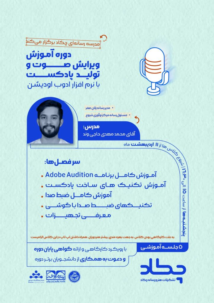شرح دوره: این دوره، شما را با تمام مراحل تولید یک پادکست حرفهای (از ایده تا انتشار) آشنا میکند. شما یاد میگیرید چگونه صدا را ضبط کنید، نویزها را حذف کنید، افکتهای صوتی اضافه کنید، موسیقی متن مناسب انتخاب کنید، و پادکست خود را در پلتفرمهای مختلف منتشر کنید.