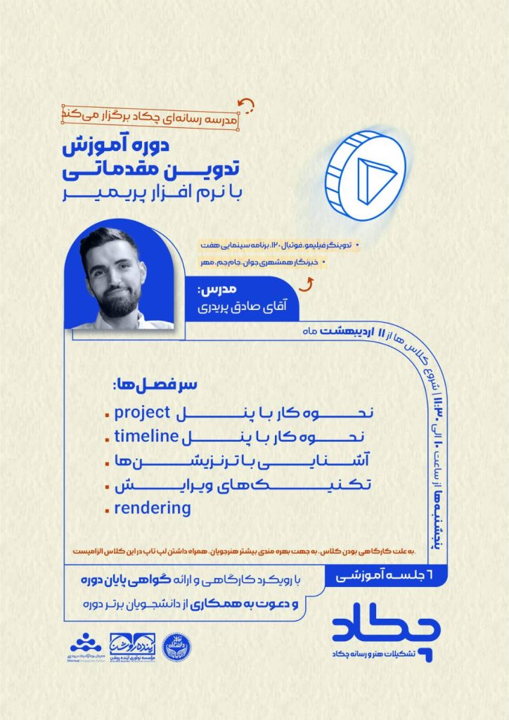 شرح دوره: این دوره، شما را با نرمافزار تدوین فیلم (Premiere) آشنا میکند. شما یاد میگیرید چگونه فیلمها را برش دهید، سکانسها را به هم بچسبانید، افکتهای بصری و صوتی اضافه کنید، رنگها را تنظیم کنید، و فیلم خود را برای انتشار در پلتفرمهای مختلف آماده کنید.